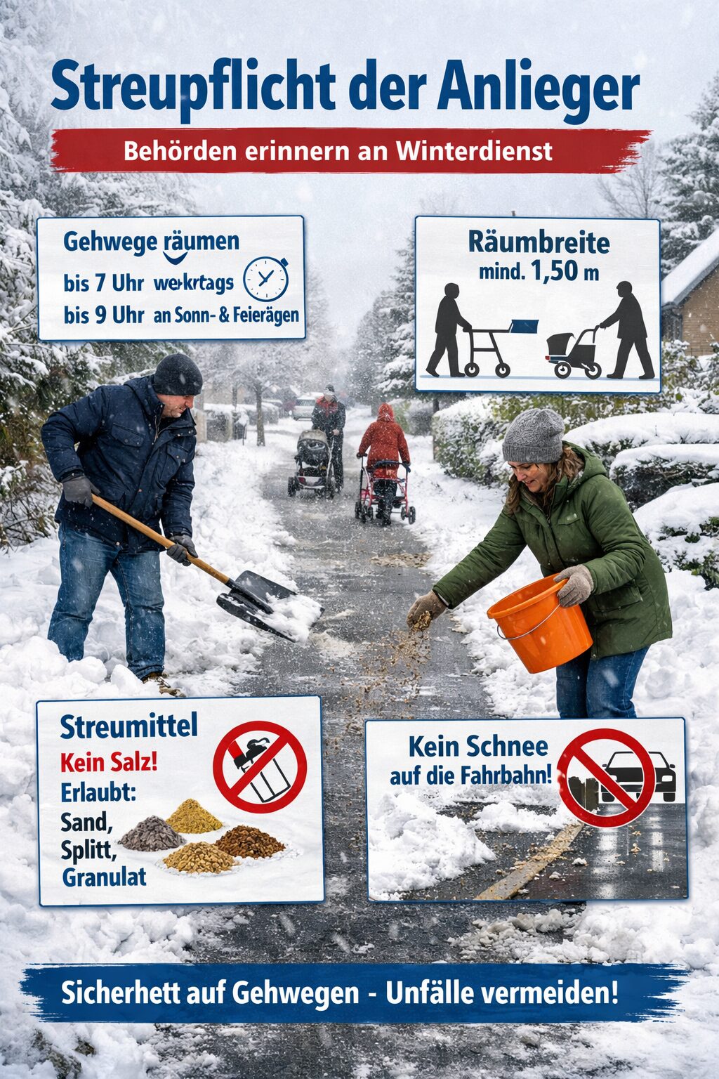 Besonderes Augenmerk gilt der Räumbreite: Der Schnee ist auf mindestens 1,50 Meter zu entfernen. So soll sichergestellt werden, dass Begegnungsverkehr – etwa mit Kinderwagen, Rollatoren oder Gehhilfen – gefahrlos möglich bleibt.