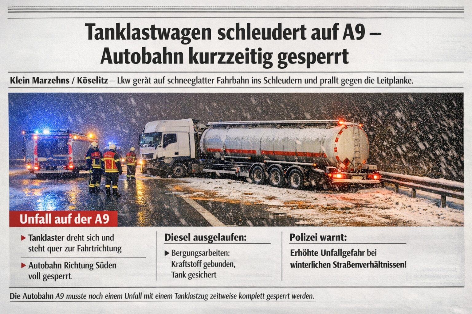 Bei winterlichen Straßenverhältnissen ist es am Montagabend (26. Januar) auf der Autobahn A9 zu einem Unfall mit einem Tanklastwagen gekommen. Zwischen den Anschlussstellen Klein Marzehns und Köselitz geriet der Lastzug gegen 20.15 Uhr in Fahrtrichtung Leipzig auf schneeglatter Fahrbahn ins Schleudern.