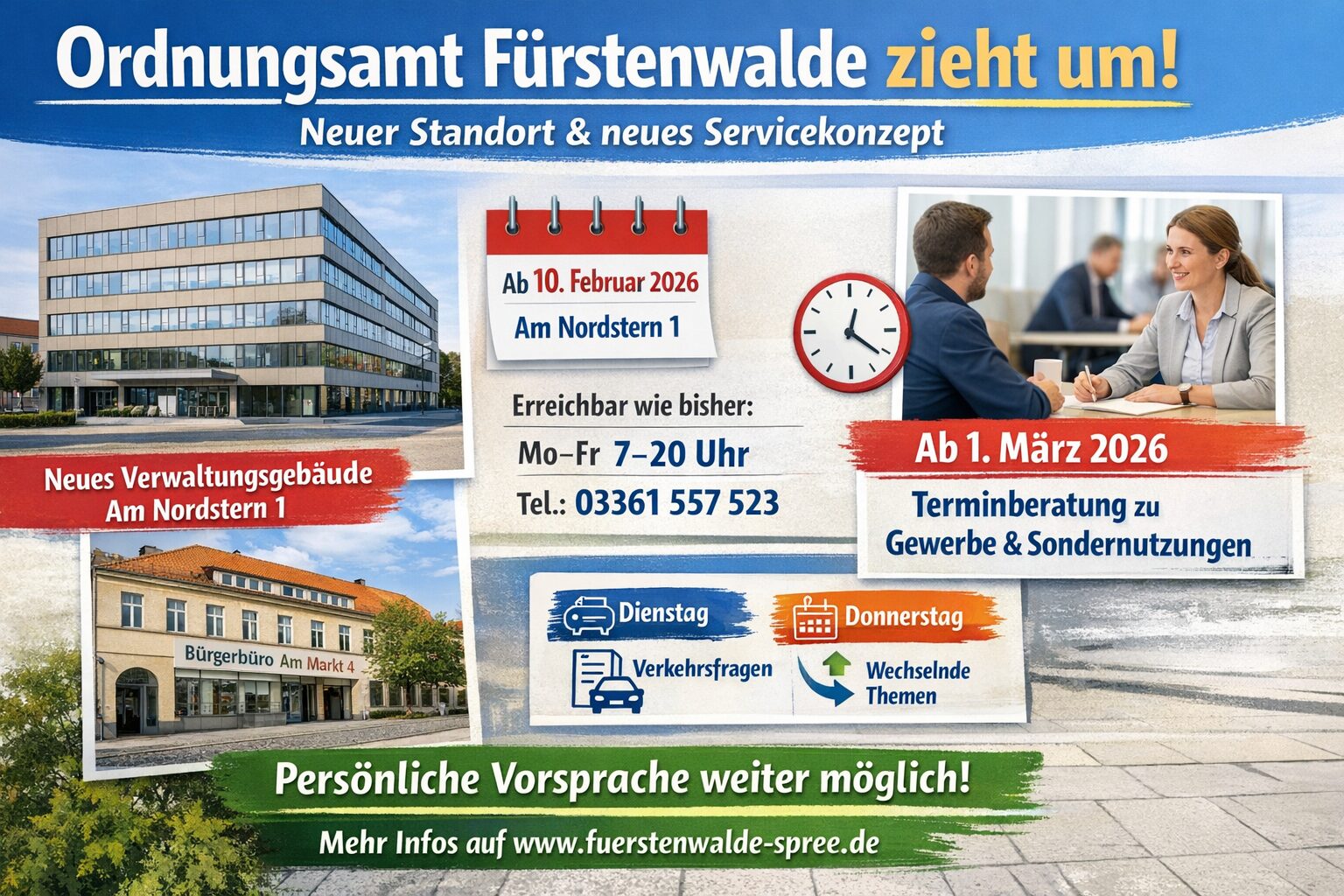 Für Bürgerinnen und Bürger in Fürstenwalde/Spree stehen beim Ordnungsamt in den kommenden Wochen einige Veränderungen an. Die Behörde bezieht ein neues Verwaltungsgebäude und stellt zugleich ihr Serviceangebot neu auf.